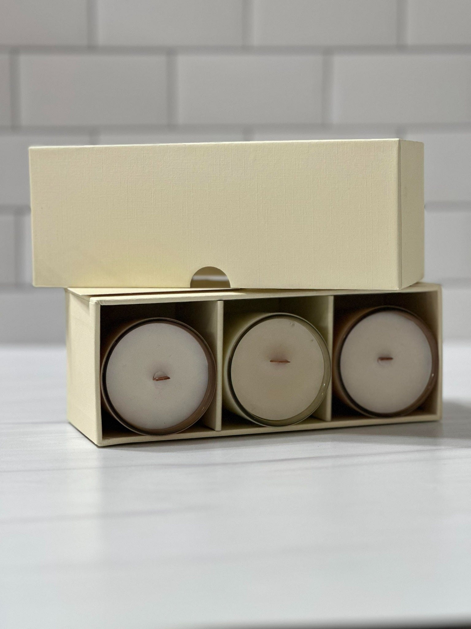 Indulge in luxury with our Mini Candle Trio Gift Box Set. This elegant set includes three high-quality mini candles, perfect for gifting and discovering new fragrances. Designed for smaller spaces, each 2.5 oz candle burns beautifully, creating a sustainable and luxurious ambiance. Elevate your environment with our Mini Candle Gift Box Set.